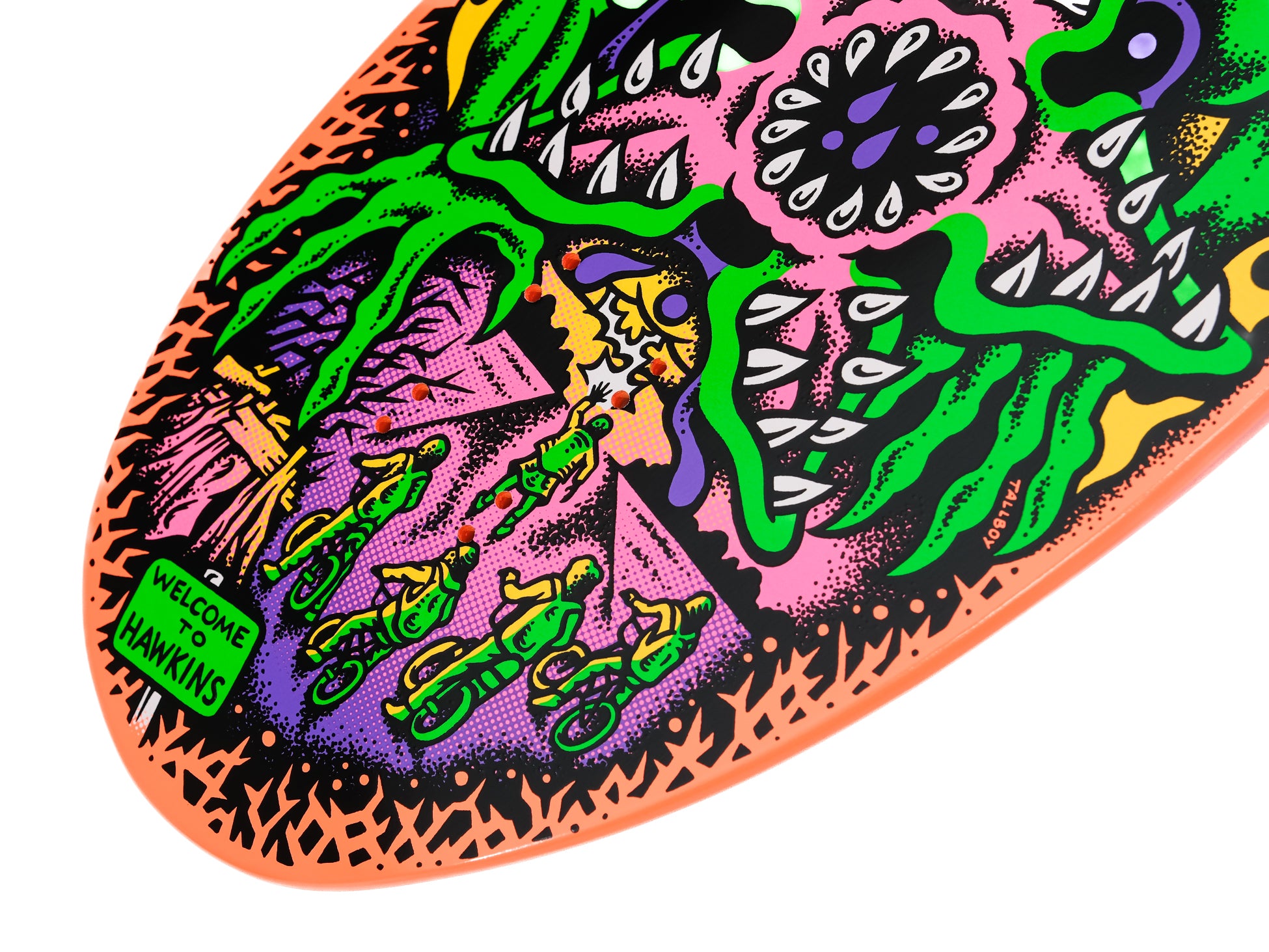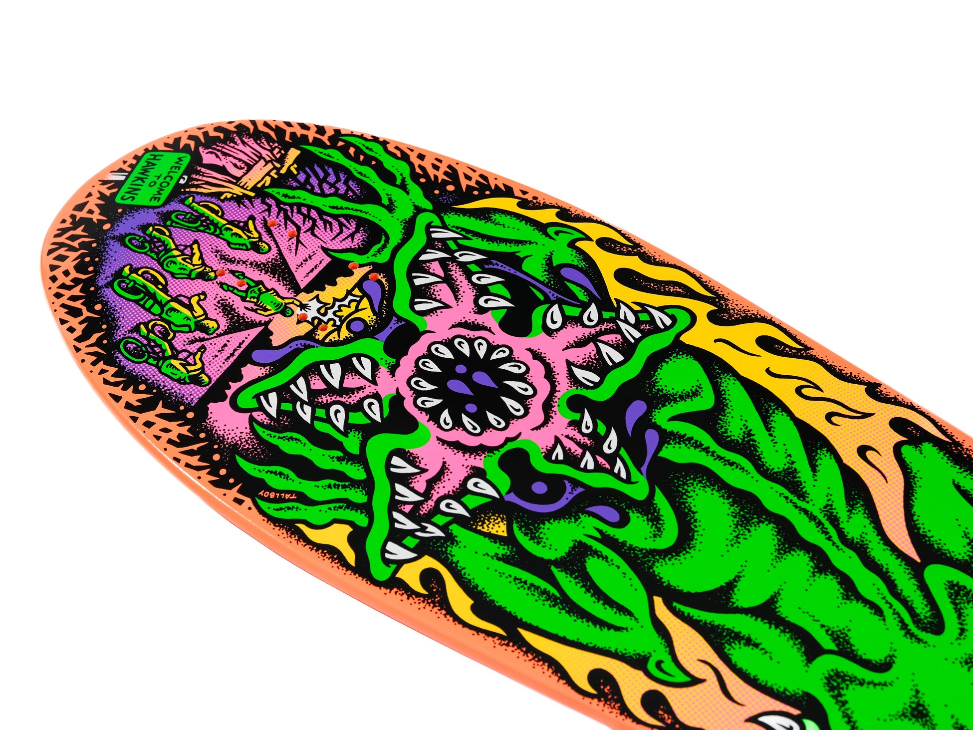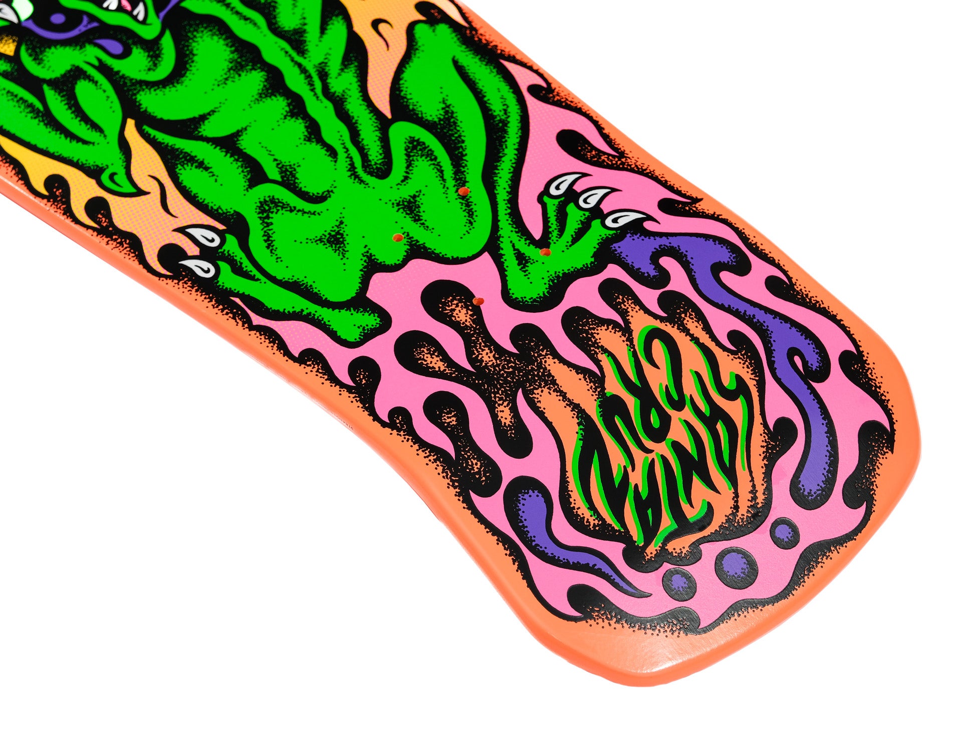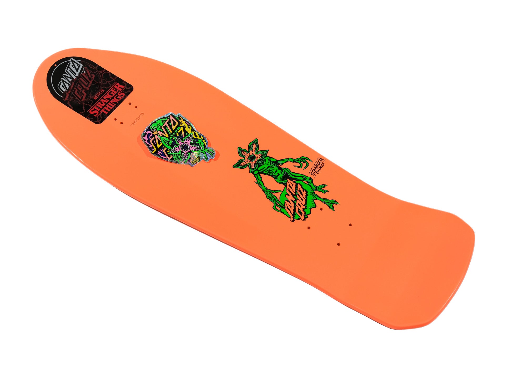 The Santa Cruz Salba Demogorgon 10.3in x 31.1in deck features multicolor glow in the dark graphics on fully dipped orange deck in Steve Alba's OG Tiger shape. This deck also features adjustable 14.5-15" wheelbase.